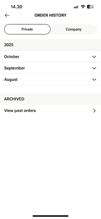 You can also switch between Private and Company receipts for company invoices within the order history.